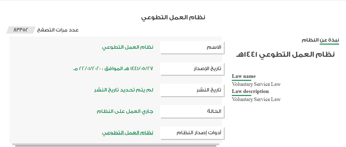 نظام العمل التطوعي 1441 هـ المصدر :- الموقع الرسمي لهيئة الخبراء بمجلس الوزراء نظام العمل التطوعي إن مجلس الوزراء بعـد الاطـلاع على المعاملـة الـواردة من الـديوان الملكـي بـرقم 26079 وتاريخ 21/4/1441هـ، المشتملة على خطاب معالي رئيس مجلـس الشورى رقم 619 وتاريخ 7/2/1432هـ، في شأن مشروع نظام العمل التطوعي. وبعد الاطلاع على مشروع النظام المشار إليه. وبعد …